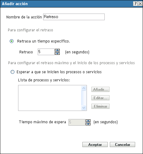Esperar a que se inicien los procesos o servicios: especifique los procesos o servicios que deben iniciarse antes de que se lleve a cabo la siguiente acción del conjunto.