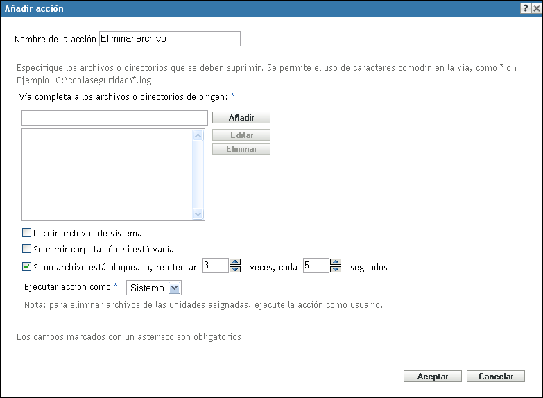 El recuadro de diálogo Acción - Eliminar archivo permite especificar archivos o directorios para eliminarlos del dispositivo.