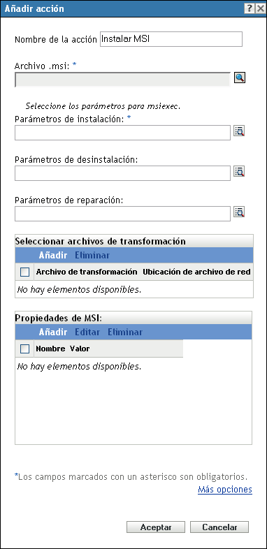 El recuadro de diálogo Acción - Instalar MSI permite especificar la ubicación del archivo MSI, los parámetros de instalación, desinstalación y reparación correspondientes, el archivo de transformación y el nivel de seguridad del ejecutable.