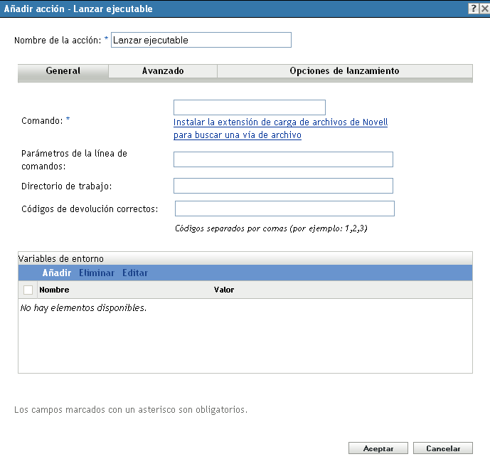 La página General permite especificar la ubicación del ejecutable de Windows, los parámetros de línea de comandos que se deben ejecutar al lanzar el ejecutable, el directorio de trabajo del ejecutable y los códigos de funcionamiento correcto distintos de cero que devuelve el ejecutable.