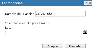 El recuadro de diálogo Acción - Lanzar lote permite especificar el lote que se debe lanzar en el dispositivo.