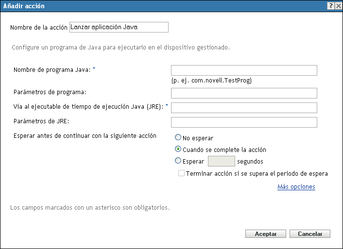 El recuadro de diálogo Acción - Lanzar aplicación Java permite configurar un programa Java* para ejecutarlo en el dispositivo gestionado.