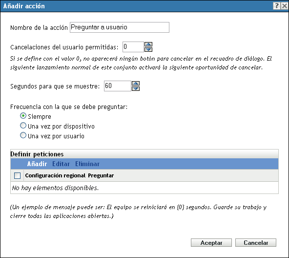 Segundos para que se muestre: permite especificar el número de segundos que se debe mostrar la pregunta antes de que se lleve a cabo la acción. Por ejemplo, supongamos que se configura una pregunta durante la instalación de una aplicación antes de que el dispositivo efectúe un rearranque necesario. Si especifica que el usuario puede cancelar el conjunto de acciones y que la pregunta se muestre durante 10 segundos antes de que venza el tiempo, la pregunta se mostrará durante 10 segundos y, a continuación, el dispositivo se rearrancará.