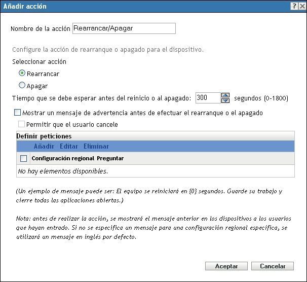 El recuadro de diálogo Acción - Rearrancar/Apagar permite especificar la acción de rearranque o de apagado para el dispositivo.