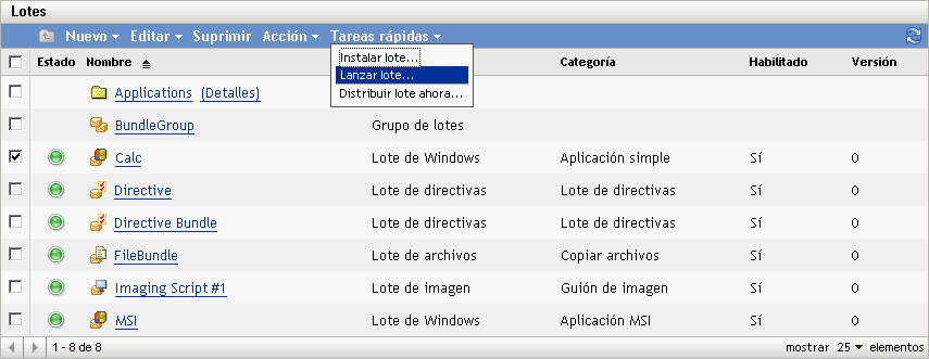 La opción permite lanzar de inmediato un lote en uno o varios dispositivos. Si el lote no está instalado, se instala y se lanza.