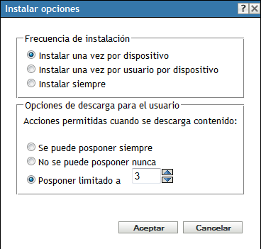 El recuadro de diálogo Opciones de instalación permite especificar la frecuencia con la que se deben llevar a cabo las acciones de instalación del lote en los dispositivos gestionados y especificar si los usuarios pueden posponer la instalación del lote.