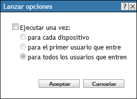 Ejecutar una vez: seleccione esta opción para configurar las acciones de lanzamiento del lote y después elija una de las opciones siguientes. Si no selecciona esta opción (la opción por defecto), las acciones de lanzamiento se llevarán a cabo siempre que un usuario lance la aplicación incluida en el lote.