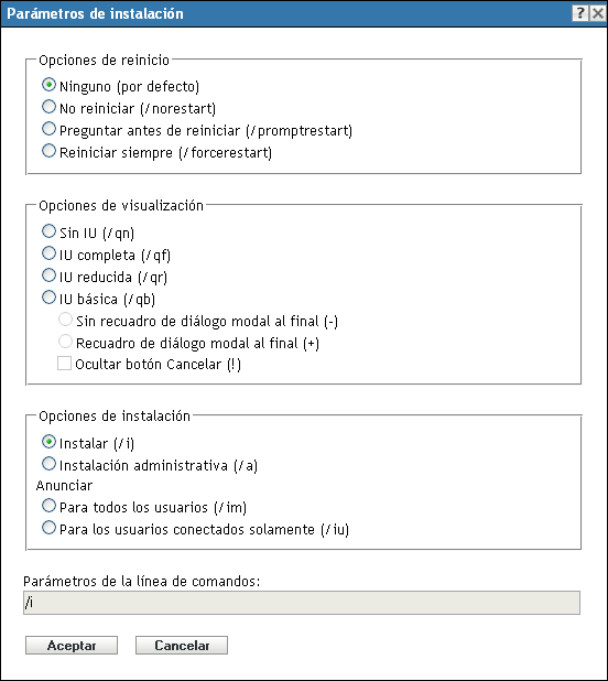 En el recuadro de diálogo Parámetros de instalación, seleccione las opciones de visualización deseadas. Puede elegir si desea llevar a cabo la instalación con o sin interfaz de usuario, si desea que se muestre un recuadro de diálogo modal al final del proceso (un recuadro de diálogo modal requiere una respuesta por parte del usuario para que finalice la instalación), o bien que se oculte el botón para que los usuarios no puedan cancelar la instalación.
