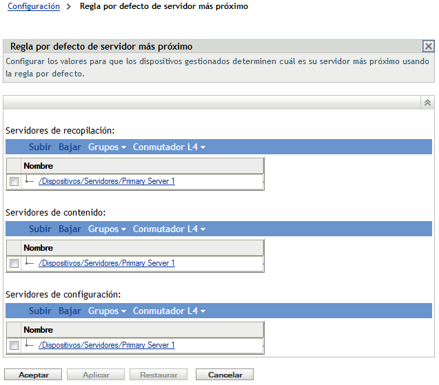 La regla por defecto de servidor más próximo permite definir la regla que utiliza un dispositivo para determinar los servidores de recopilación, contenido y configuración más cercanos cuando no se hayan definido reglas del servidor más próximo o éstas no sean aplicables. Esta regla es simplemente una lista de los servidores en el orden en el que desee que los dispositivos se pongan en contacto con ellos. No es posible añadir ni eliminar servidores de las listas.