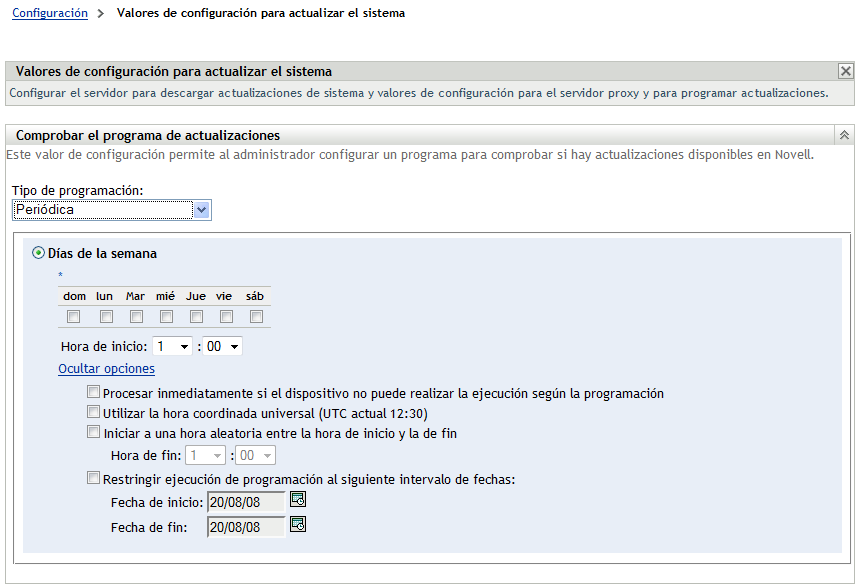 Puede especificar la frecuencia con la que desea que se compruebe si hay actualizaciones. De esta forma, la información sobre las actualizaciones disponibles se descarga automáticamente desde Novell® al panel Actualizaciones de sistema disponibles, en la pestaña cuando se activa la programación. Esta acción no descarga el contenido de la actualización en sí. Las descargas se pueden programar mediante el panel Programación de descarga (consulte Programación de descarga).