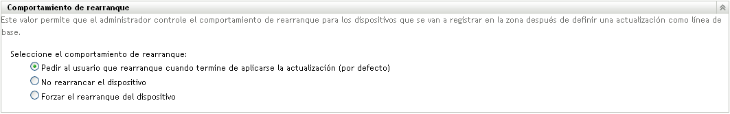 Solicitar al usuario el rearranque una vez aplicada la actualización (por defecto): inmediatamente después de aplicar la actualización, se muestra la solicitud de rearranque. Si el usuario rechaza la petición inicial, recibirá periódicamente solicitudes para rearrancar el dispositivo hasta que finalmente decida hacerlo.