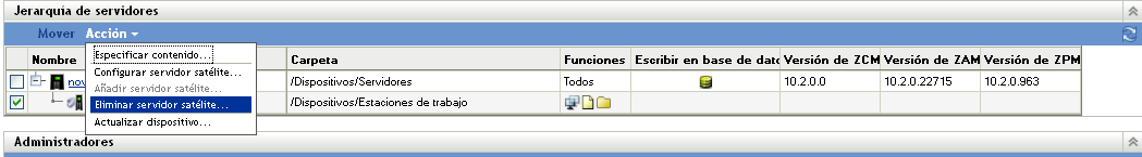 Es posible eliminar un satélite de la jerarquía de servidores cuando ya no se necesite para realizar funciones de satélite. El objeto del dispositivo no se elimina de ZENworks, simplemente se elimina de la lista Jerarquía de servidores. Sin embargo, quitar un satélite de la lista de jerarquía no provoca que el contenido, la generación de imágenes o la información de transferencia ascendente de recopilación se eliminen del dispositivo.