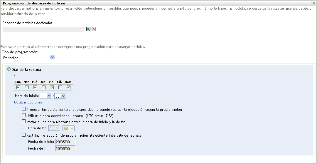 Restringir ejecución de programación al siguiente intervalo de fechas: además de las otras opciones, puede especificar un rango de fechas en las que se debe comprobar si hay actualizaciones de noticias.