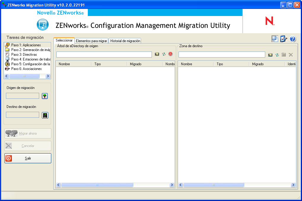La utilidad de migración de ZENworks está compuesta por una pantalla de migración que permite diseñar un modelo de migración y realizar el proceso: