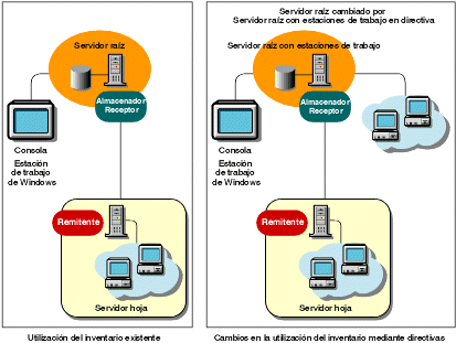 Por ejemplo, si el plan de implantación identifica tres servidores, como un Servidor raíz, un Servidor intermedio con base de datos y un Servidor hoja para la implantación del inventario, instale Inventario de la estación de trabajo en dichos servidores y elija la función del servidor. Más adelante, si desea hacer cambios en la implantación del inventario, como conectar las estaciones de trabajo incluidas en el inventario al servidor raíz existente, necesitará cambiar la función del objeto Servicio de inventario de Servidor raíz a Servidor raíz con estaciones de trabajo incluidas en inventario. Además, dependiendo de la nueva función, es necesario configurar algunas directivas.