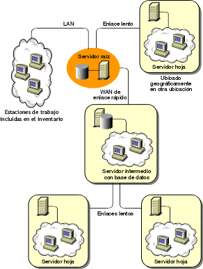 En esta configuración, los servidores de Inventario están conectados al servidor intermedio a través de enlaces WAN lentos. El servidor intermedio también tiene una base de datos de inventario y transmite la información al servidor raíz. Otros servidores de Inventario también están conectados al servidor raíz.
