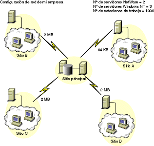 La ilustración siguiente ilustra la organización en red de una empresa con servidores en distintos sitios.