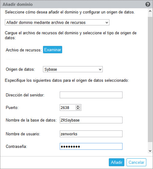 Seleccione Añadir dominios desde la zona de gestión de ZENworks y especifique lo siguiente: