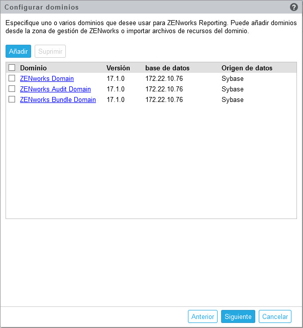 Especifique uno o varios dominios que desee utilizar para ZENworks Reporting. Puede agregar dominios de la zona de gestión de ZENworks o importar archivos de recursos de dominio.