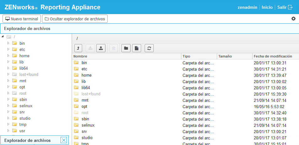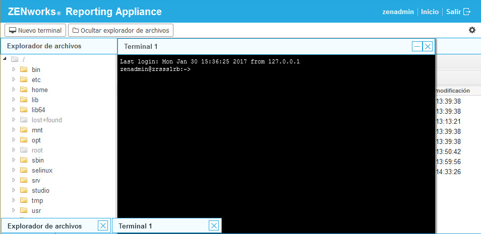 En la página principal de ZENworks Reporting Appliance, en ZENworks Reporting Appliance, haga clic en Terminal y explorador de archivos.