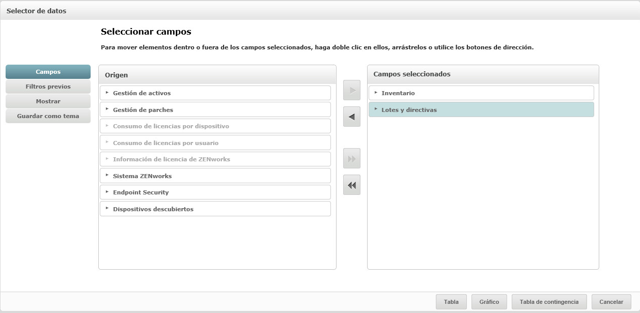 Debe seleccionar elementos de Source (Origen) para Selected Fields (Campos seleccionados), a fin de habilitar los botones Pre-filters (Filtros previos), Display (Visualización) y Save as Topic (Guardar como tema). Los campos Pre-filters (Filtros previos), Display (Visualización) y Save as Topic (Guardar como tema) son opcionales y se pueden usar en cualquier orden. Haga clic en Table, Chart (Tabla, Gráfica) o Crosstab (Referencias cruzadas) en cualquier momento para diseñar una vista basada en los datos seleccionados.