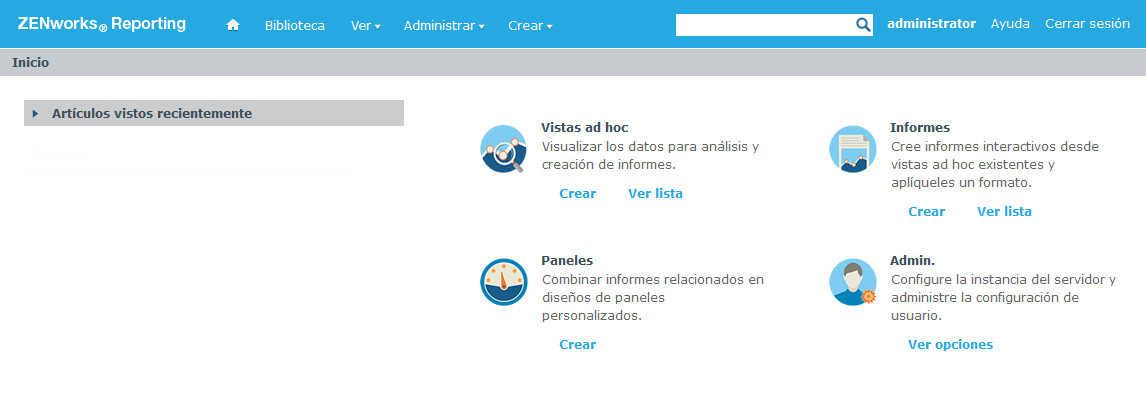 La ID de usuario especificada se autenticará internamente con el servidor LDAP. Después de la autorización, el servidor LDAP le permitirá entrar a la sesión en la aplicación. A continuación se mostrará la página principal de ZENworks Reporting.