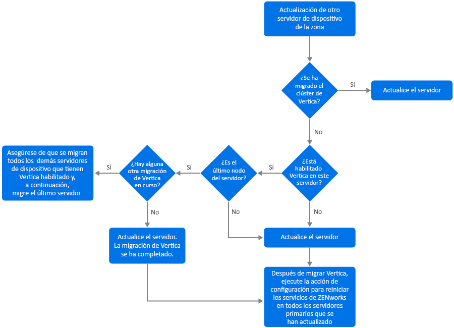 Después de actualizar el último nodo del clúster de Vertica, ejecute la acción de configuración microfocus-zenworks-configure-c Start para reiniciar los servicios de ZENworks en todos los servidores primarios que se hayan actualizado hasta ahora.