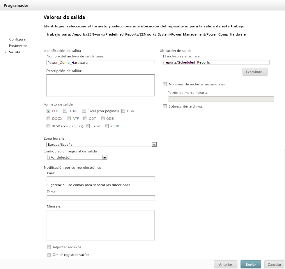 Attach Files (Adjuntar archivos): seleccione esta opción para enviar la salida del informe con la notificación de correo electrónico.