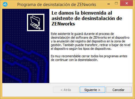 Esta pantalla solo se muestra si ha entrado en la zona de gestión a fin de anular el registro del dispositivo durante la desinstalación del software de ZENworks. La única opción disponible es Desinstale el agente de ZENworks y anule el registro del dispositivo de la zona. Haga clic en Siguiente para confirmar la operación. |