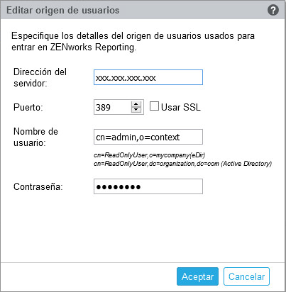 • Nombre de usuario: ZENworks Reporting Server debe tener acceso de solo lectura al directorio LDAP para poder autenticar cada intento de entrada. Las credenciales de este usuario se utilizan para obtener acceso de solo lectura.