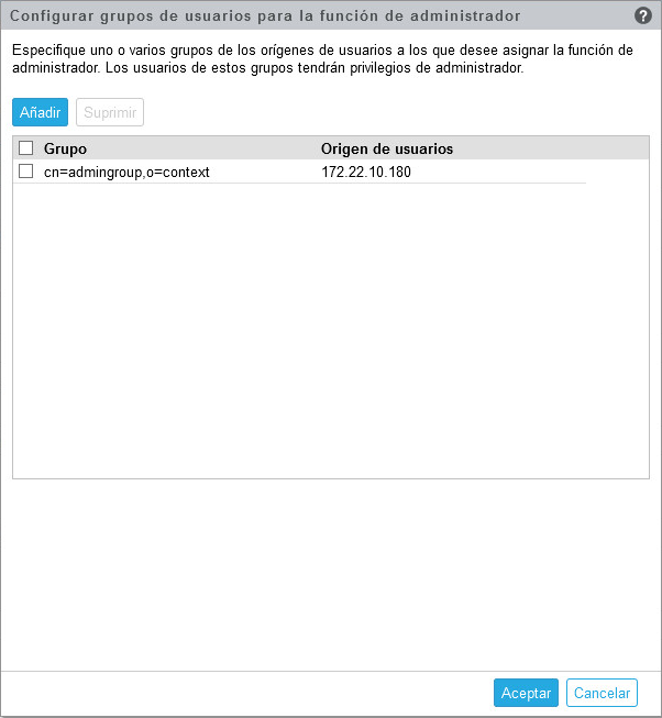 • Para Active Directory: los usuarios de esos subgrupos no tendrán privilegios de administrador. Para asignar a estos usuarios privilegios de administrador, configúrelos individualmente.