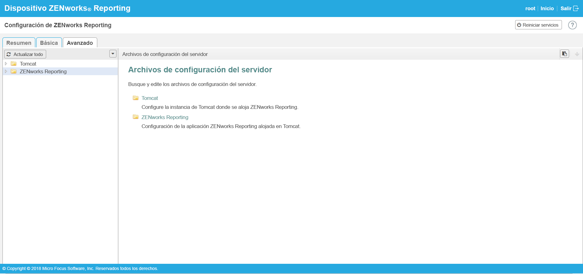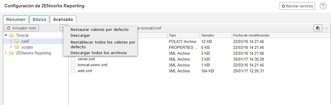 La vista Avanzado permite ver, configurar o editar cualquier archivo de configuración del servidor relacionado con ZENworks Reporting, como Tomcat y ZENworks.