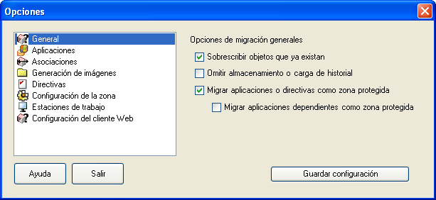 Es posible utilizar las ventanas Opciones de la utilidad de migración para configurar algunas opciones antes de migrar objetos a ZENworks Configuration Management. Para lanzar la ventana Opciones, haga clic en