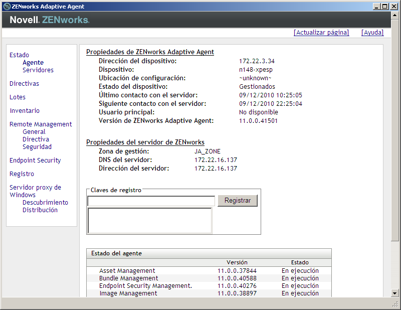 Estado: proporciona información diversa, como la última vez que el agente contactó con un servidor de ZENworks y si los módulos del agente se están ejecutando o no.