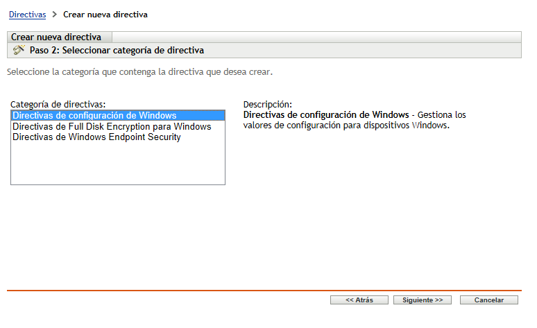 En la página Seleccionar categoría de directivas, seleccione y haga clic en
