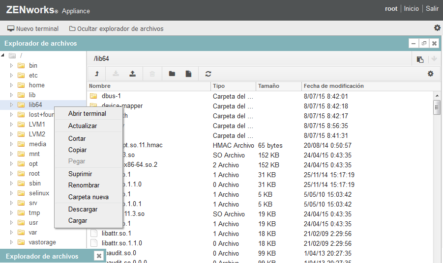 Si entra como usuario zenadmin, todas las operaciones de archivos se ejecutarán como el usuario zenworks.