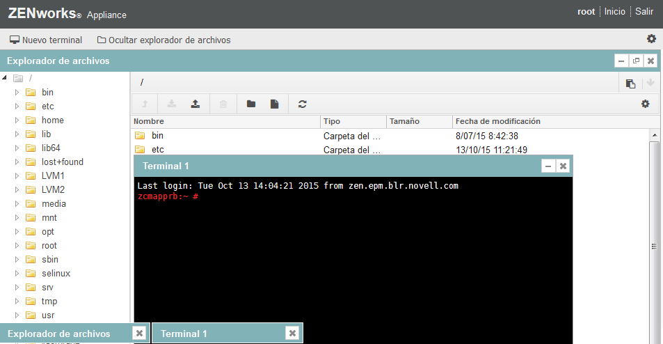 Si ha entrado como usuario zenadmin o root, puede abrir una sesión de terminal. El usuario zenadmin puede ejecutar comandos de ZENworks como zman, zac y novell-zenworks-configure.