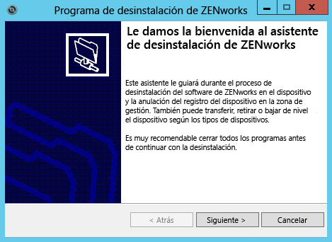 Haga clic en Siguiente y siga las indicaciones para desinstalar el software de ZENworks. Consulte la información de la tabla siguiente si tiene preguntas sobre alguna de las opciones de desinstalación.