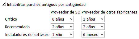 Inhabilitación de contenido por antigüedad: esta nueva opción se ha añadido para gestionar el contenido antiguo. Ahora es posible inhabilitar automáticamente contenido anterior a la fecha de caducidad seleccionada. La función evita que se distribuyan parches antiguos y reduce el ámbito de listado de la pestaña Parches. Por ejemplo, puede definir que los instaladores de otros fabricantes se inhabiliten automáticamente después de seis meses.