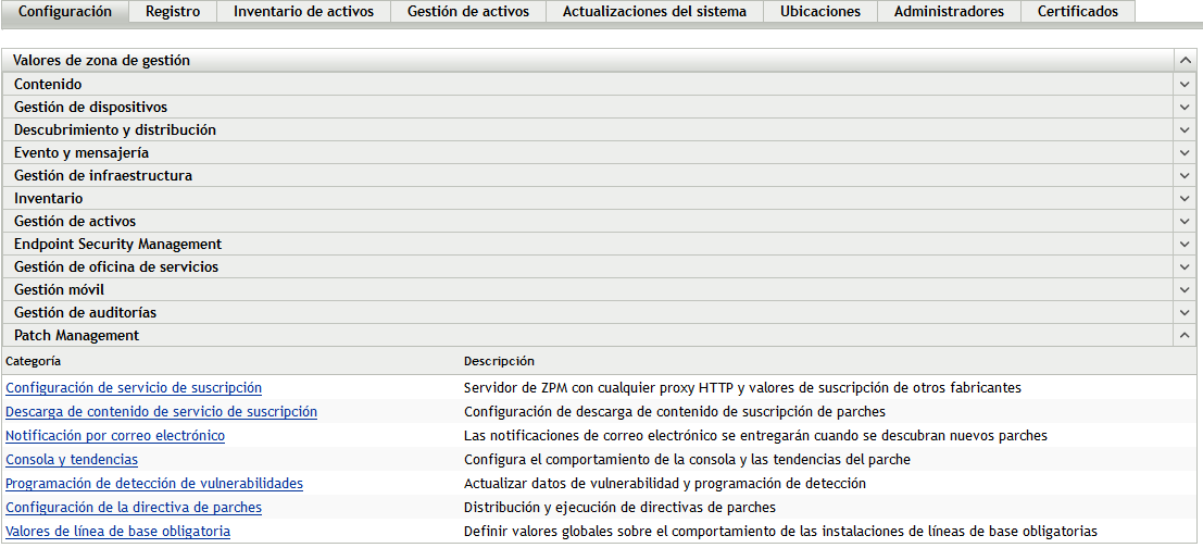 Reorganización de la configuración de Patch Management: los valores de configuración de Patch Management en Valores de zona de gestión se han reorganizado en varias páginas. El nuevo diseño es más intuitivo. Sin embargo, los usuarios con experiencia en Patch Management pueden descubrir que algunos de los valores se han trasladado de las páginas a las que están acostumbrados.