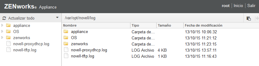 Esta opción permite ver los registros del servidor primario de ZENworks. Los registros se clasifican en registros del dispositivo, registros del sistema operativo y registros de ZENworks Dentro de ZENworks, los registros se clasifican según los distintos componentes.