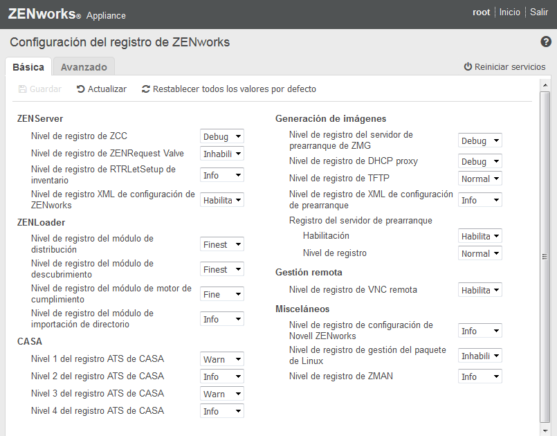 Puede ver todos los archivos de registro de configuración que estén categorizados lógicamente en el servidor primario de ZENworks. En la vista Básica se muestran los valores de configuración del registro usadas con más frecuencia y es posible establecer distintos niveles de registro: depuración, información, desactivado, advertencia y error.