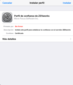 El perfil de confianza de ZENworks contiene el certificado necesario para la comunicación segura entre el dispositivo y el servidor primario de ZENworks.