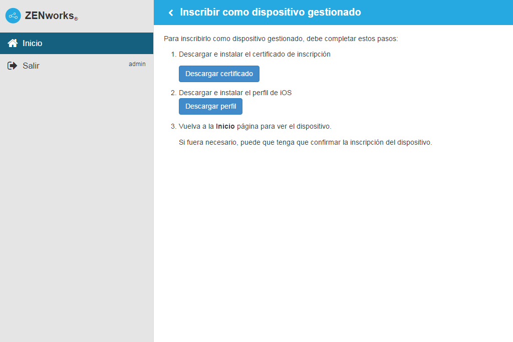 El perfil de inscripción de dispositivos de ZENworks contiene el perfil de MDM necesario para que ZENworks pueda gestionar el dispositivo.