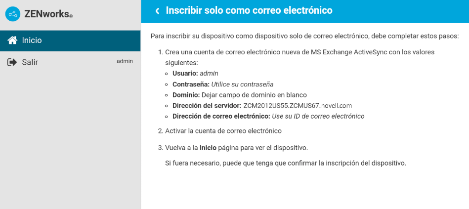 Este escenario muestra cómo inscribir un dispositivo como dispositivo solo de correo electrónico en la zona de gestión de ZENworks. Este escenario describe el procedimiento para inscribir un dispositivo iOS como dispositivo solo de correo electrónico.