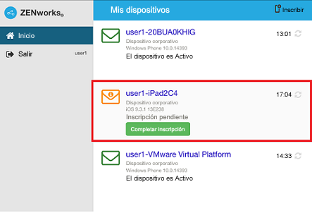 En ZENworks User Portal, el dispositivo se muestra en la lista Mis dispositivos. En este momento, el dispositivo se ha añadido a la zona de gestión de ZENworks, pero está pendiente de la inscripción.