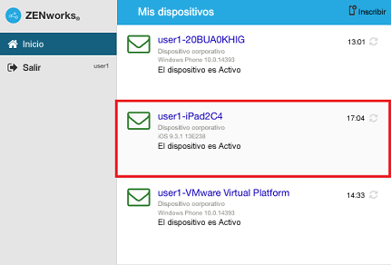 Todos los dispositivos asociados con el usuario se muestran en ZENworks User Portal.