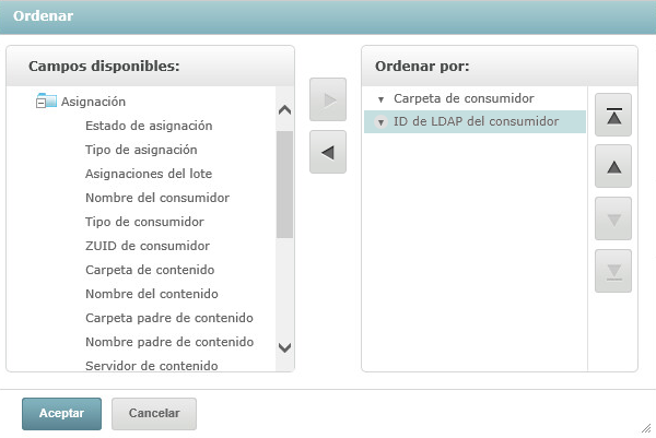 Seleccione cada campo en el panel Sort (Ordenar) y haga clic en Move to top (Al primer lugar), Move up (Subir), Move down (Bajar) o Move to bottom (Al último lugar).