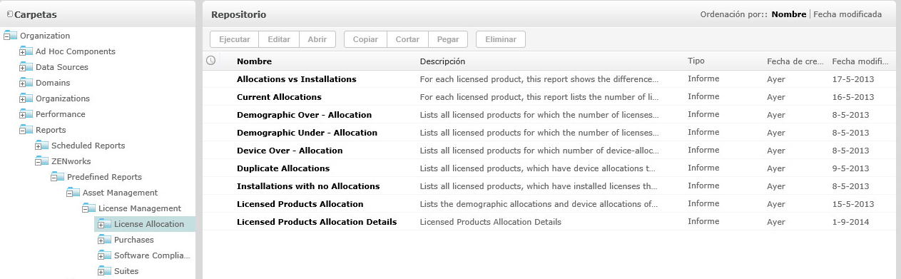 El repositorio es el almacén interno para los informes, las vistas de análisis y los archivos relacionados del servidor. El repositorio está organizado en carpetas que contienen recursos, como los sistemas de archivos. Sin embargo, a diferencia de los sistemas de archivos, el repositorio se almacena como una base de datos privada a la que solo puede acceder directamente ZENworks Reporting.