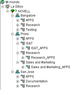Si el árbol de eDirectory tiene varios sitios, se recomienda ubicar los objetos Aplicación en el árbol del mismo sitio en que se encuentren los usuarios que los vayan a utilizar, así como asegurarse de que la partición de eDirectory para dicho sitio se replica a uno o varios servidores del sitio. Normalmente esto significa que se dispone de contenedores APPS en varios sitios, como puede verse a continuación.